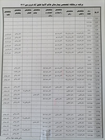 اخبار 27 اسفند 1401 بازدید: 72 امتیاز: ( 0 Rating ) برنامه درمانگاه تخصصی بیمارستان خاتم الانبیاءدرفروردین 1402 امتیاز کاربران لطفا رای دهید رای 1 رای 2 رای 3 رای 4 رای 5 برنامه درمانگاه تخصصی بیمارستان خاتم الانبیاء(ص)خلیل آباددرفردین 1402 قبلی بعدی