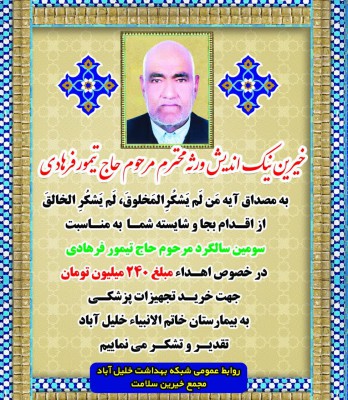 دکترحسین زاده مدیرشبکه بهداشت ودرمان خلیل آباداز کمک دومیلیاردوچهارصد میلیون ریالی ورثه مرحوم حاج تیمورفرهادی به حوزه سلامت شهرستان خبر داد.