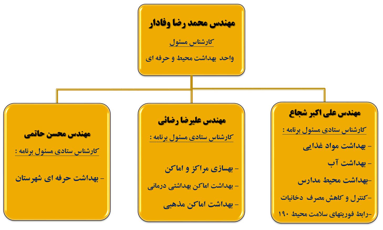 اين واحد شامل بهداشت محيط و حرفه اي مي باشد . كه نظارت بر اماكن و مراكز حرفه اي و شاغل بهداشت محيط نظارت بر اماكن تهيه و توزيع و فروش مواد غذايي و اماكن عمومي و مراكز آلوده كننده هوا ، پرتوهاي يونساز.همچنين اين واحد فعاليتهاي واحد نظارت بر مواد غذائي را انجام مي دهد.