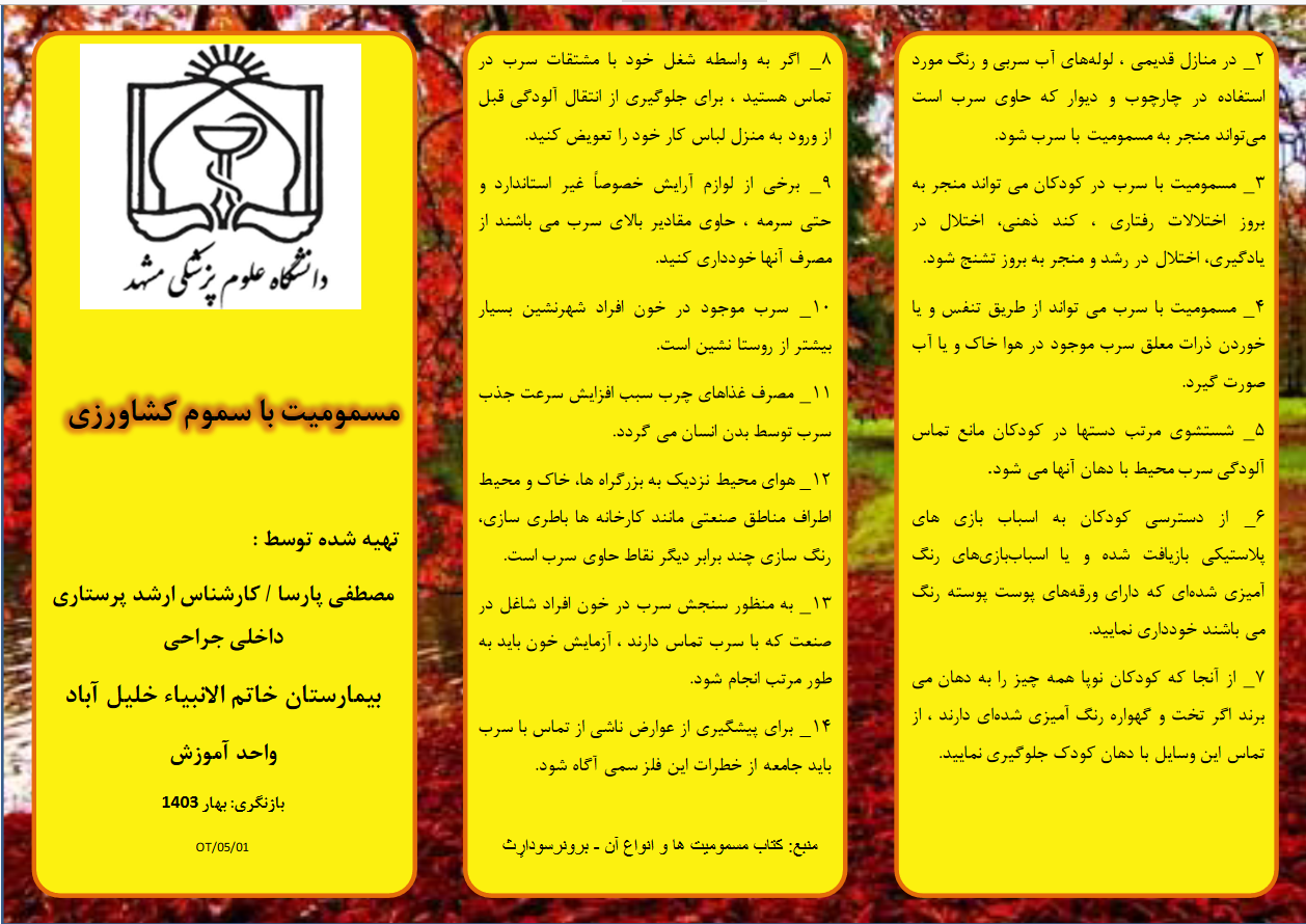 بدون مجموعه 24 خرداد 1402 بازدید: 37 امتیاز: ( 0 Rating ) مسمومیت با سموم کشاورزی امتیاز کاربران لطفا رای دهید رای 1 رای 2 رای 3 رای 4 رای 5 دانلود پمفلت قبلی بعدی
