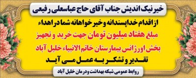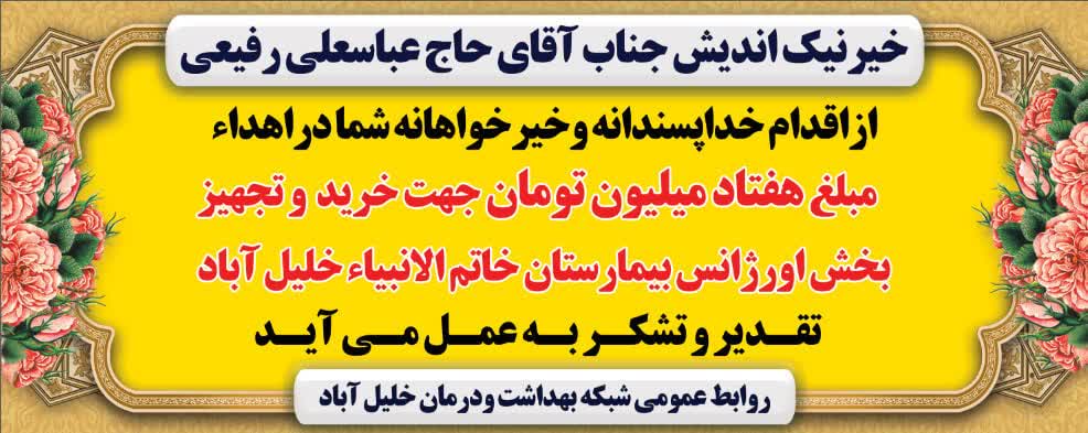 اخبار 25 آبان 1404 بازدید: 28 امتیاز: ( 0 Rating ) اقدام خداپسندانه امتیاز کاربران لطفا رای دهید رای 1 رای 2 رای 3 رای 4 رای 5 خیرنیک اندیش جناب آقای حاج عباسعلی رفیعیازاقدام خداپسندانه وخیرخواهانه شمادراهداءمبلغ هفتادمیلیون تومان جهت خریدوتجهیزبخش اورژانس بیمارستان خاتم الانبیاءخلیل آباد تقدیر و تشکر بعمل می آید قبلی بعدی